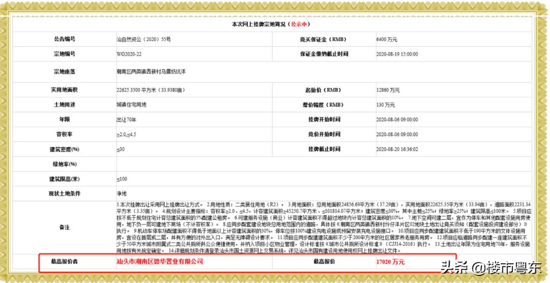 前不久(8月20日),汕头市潮南区碧华置业有限公司(碧桂园)以成交楼面价1672元/㎡、总价约1.7亿元竞得潮南区两英镇西新村乌厝奶坑洋的一宗城镇住宅用地。历时一个半小时,32轮竞价,溢价率32%。