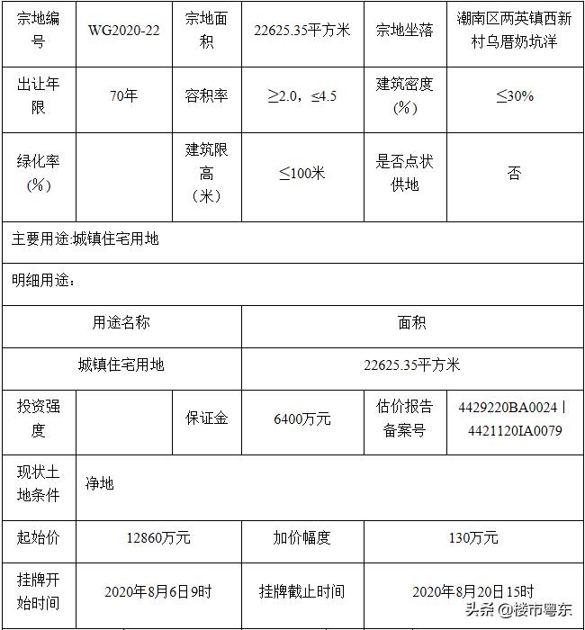 地块位于潮南区两英镇西新村乌厝奶坑洋,宗地编号为WG2020-22,总用地面积24856.69平方米(37.29亩),实用地面积22625.35平方米(33.94亩),道路面积2231.34平方米(3.35亩)。