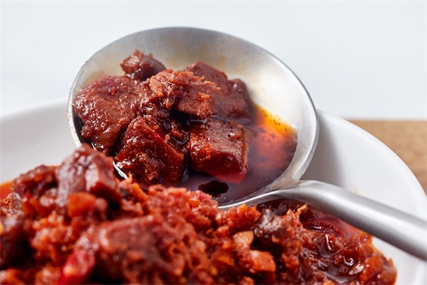 准备好配料之后,接下来就是熬酱了。把锅中倒油,开大火开始烧油,油温要稍微高一点,这样才能让料里的香味被催发出来。油烧好之后,把豆瓣酱和牛肉酱倒入油中翻炒,把香味炒出来之后,再把火关小,接着就是熬制了。用勺子轻轻的搅动锅里的料,这个时间不同太长,一般持续4-5分钟就可以了。因为时间长了,豆瓣酱会糊掉。