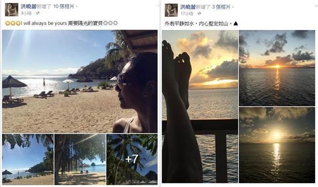 洪晓蕾昨起便在脸书分享度假悠閒照片,意有所指说:「外表平静如水,内心坚定如山」,在微博PO出的正面比基尼照片,也获得网友好评说:「美啊!」而王世均则透露人在垦丁,欣赏林晓培演唱经典歌曲《心动》,还帮宣传说「不来会遗憾」,但不知夫妻俩是一同度假,还是各自放松过节去了。