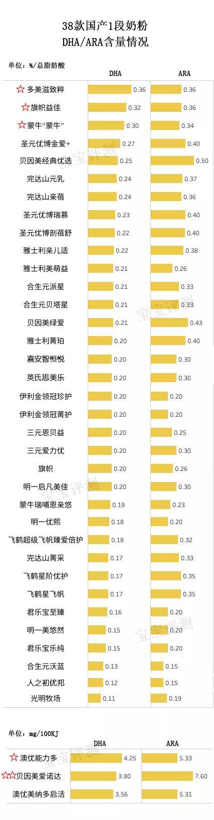 ②多美滋致粹、旗帜益佳、蒙牛“蒙牛”、澳优能力多、贝因美爱诺达,5款奶粉的DHA添加量较高区别,得到额外加分(☆)。