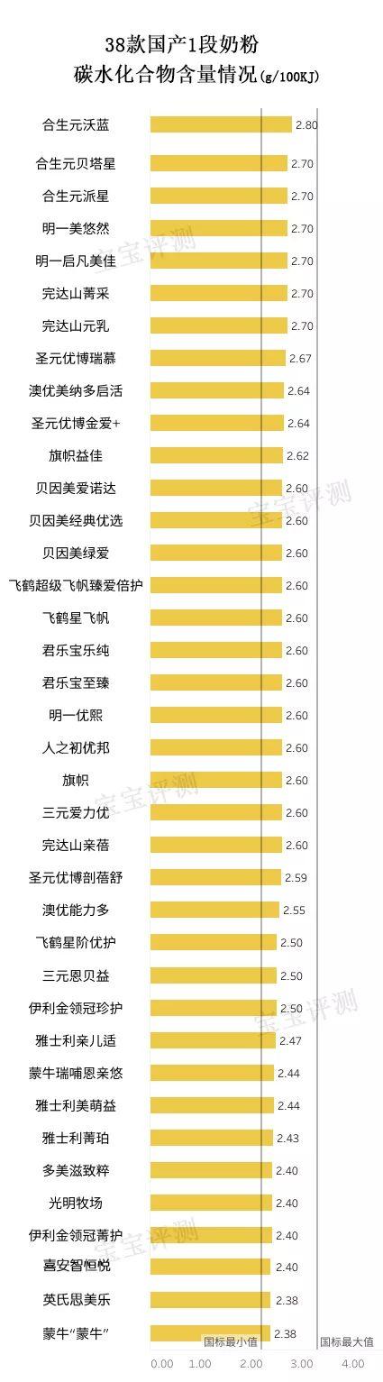 ①38款奶粉的碳水化合物含量均符合中国国标。