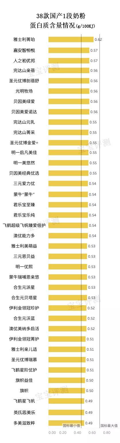 ①38款奶粉的蛋白质含量均符合中国国标。具体蛋白质的优劣,在后面的强化配方营养分析中会涉及。