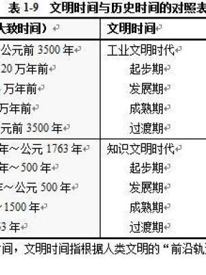在世界上,不同国家都采用统一的历史时间;但是,在同一历史时间,不同国家可能处于不同的文明时间。历史时间好比人的生物年龄,文明时间好比人的生理年龄。对于走在人类文明前列的国家,文明时间可能与历史时间是一致的;对于后进国家,文明时间与历史时间是不一致的。例如,2010年,美国处于知识文明时代,一些非洲国家处于农业文明时代。