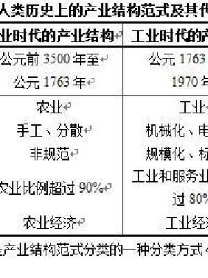 产业结构现代化研究的范式常用的分析,可以参考现代化研究的文明范式分析。依据产业结构生产力水平和结构进行分类,人类产业结构主要有四种基本类型:原始产业结构、农业时代的产结构、工业时代的产业结构和知识时代的产业结构(1-11)。它们既是产业结构变迁的不同历史阶段的形态,又同时存在于现今世界。