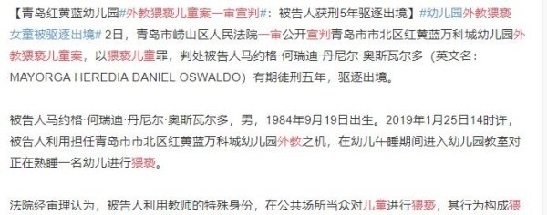 青岛红黄蓝幼儿园外教猥亵儿童案一审判决