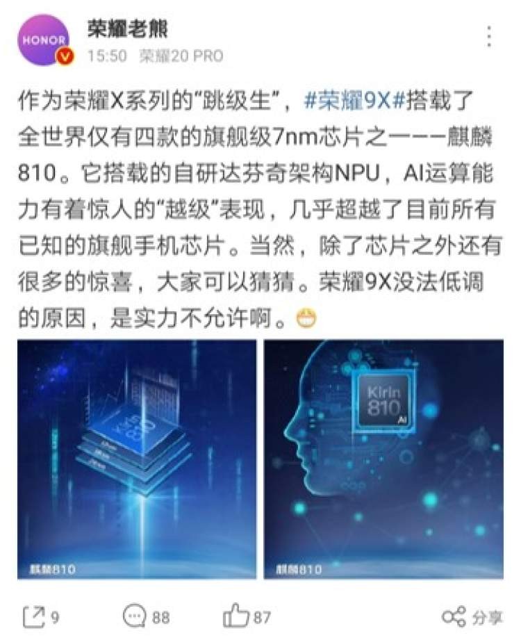 7月4日,荣耀手机官方微博今日继续预热新机。据了解,荣耀9X搭载麒麟810,其采用自研华为达芬奇架构NPU,AI跑分高达32280分。