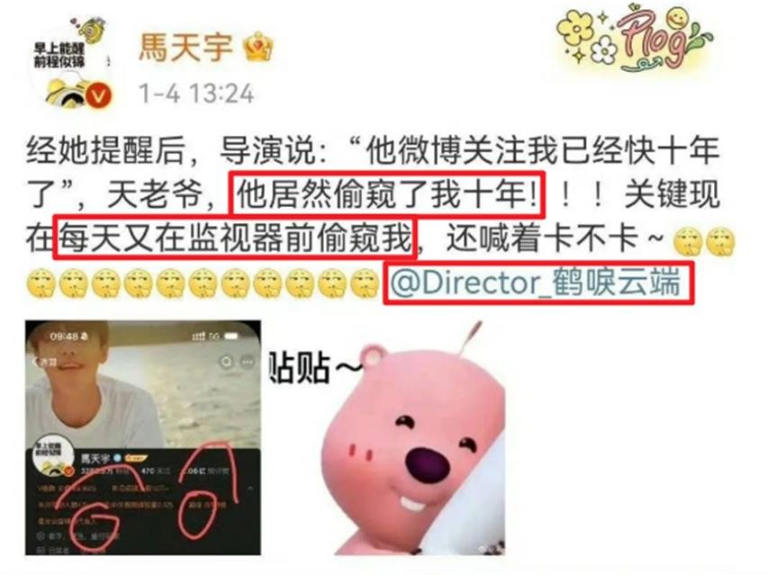 马天宇连夜删除的微博中,有一条说导演关注自己十年了,同时艾特了鹤唳云端,经常恋爱的网友会立马意识到,他发这段文字是什么意思,毕竟他那种被喜欢的人关注的窃喜溢于言表。
