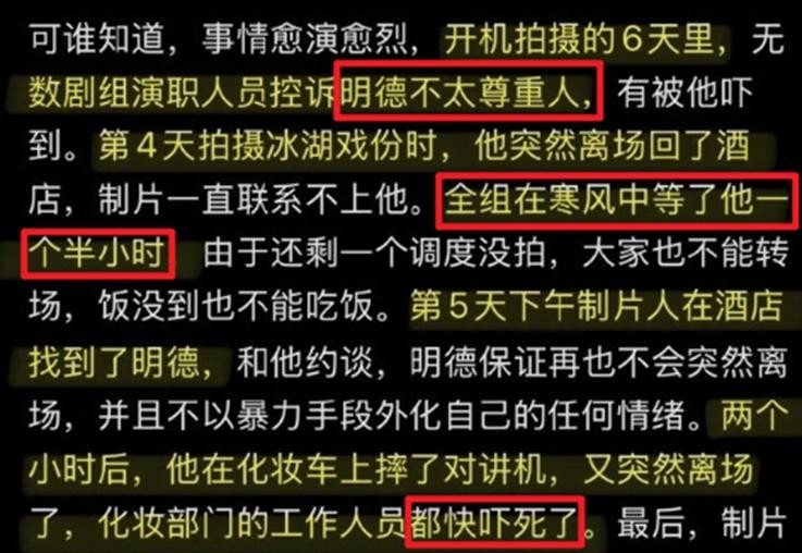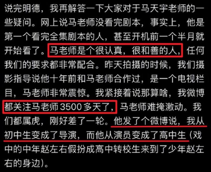 与此同时,《三人行》剧组导演鹤唳云端发长文力挺马天宇,大致意思是李明德有精神疾病,马天宇老师很好很nice,整一篇小作文口诛笔伐,好像一个李明德欺负了整个剧组,看下来让人哭笑不得。