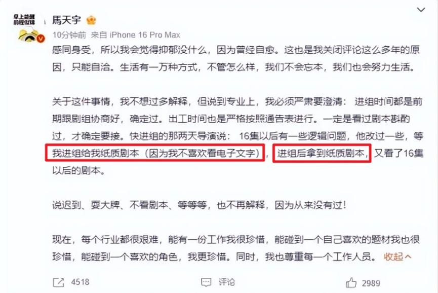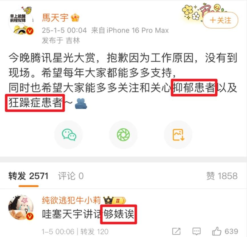 针对此事,马天宇立即出来回应,避重就轻不谈剧组问题,反而搬出了自己的抑郁者身份博同情,同时攻击李明德狂躁症,阴阳意味十分明显。