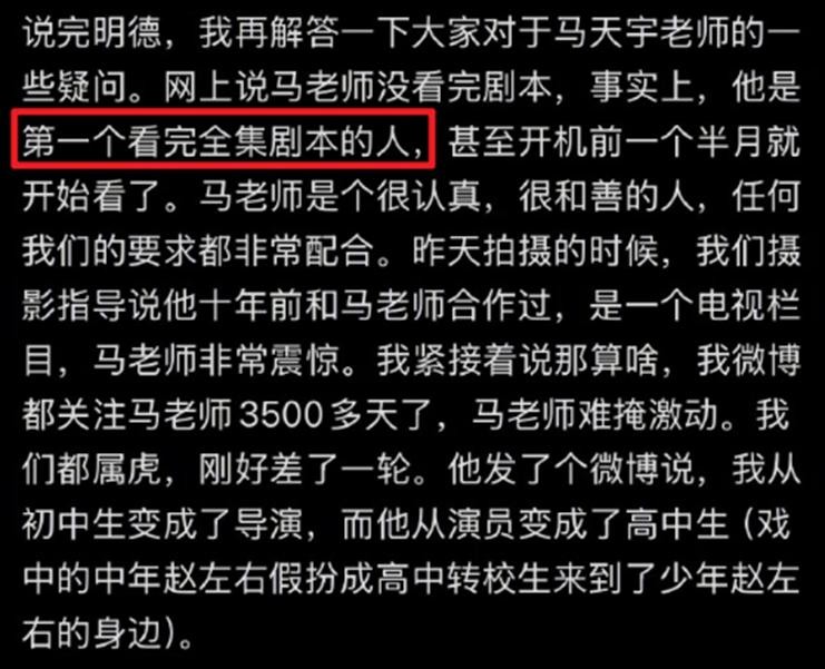 反倒是导演说马天宇是第一个看完剧本的人,结果马天宇自曝只看纸质剧本,进组后才拿到剧本,那第一个看完剧本又是从何而来呢?对口供都不好好对一下,显得情感太过于表面了吧。