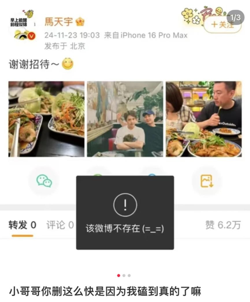 除此之外,马天宇曾经分享过吃饭照片,照片中,他与一位男性关系亲密,被环住肩膀,抿嘴瞪眼,表情很是呆萌,不知什么原因他要删掉这条微博,没有和《三人行》剧组的相关信息,那就可能是和照片中的人相关。