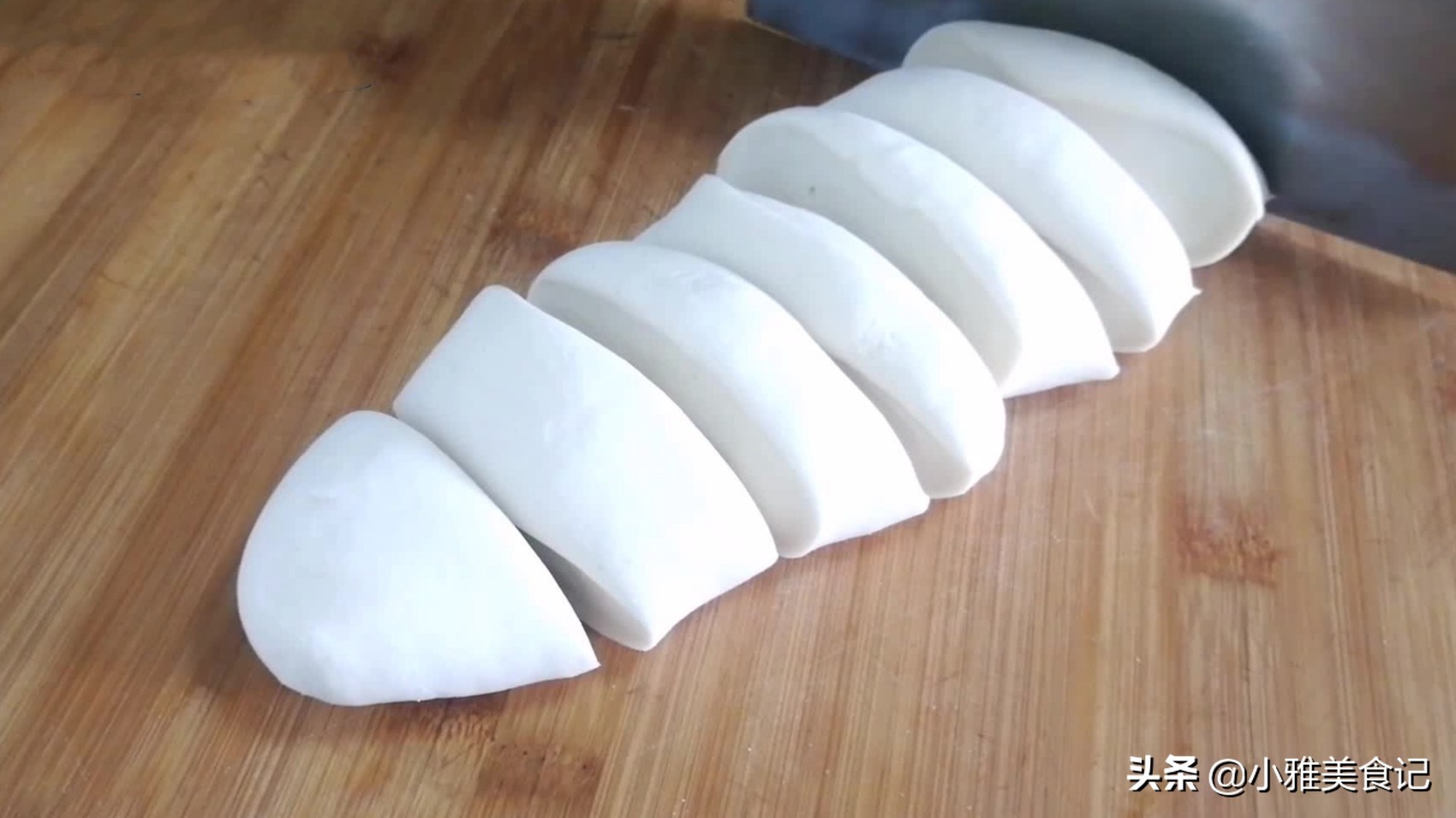 2.揉好之后把它放到案板上,搓成长条,用刀切成8个剂子,然后将小剂子切成条。